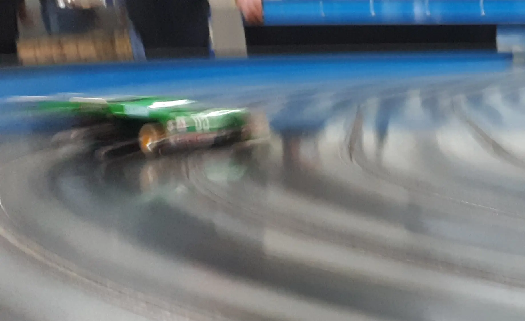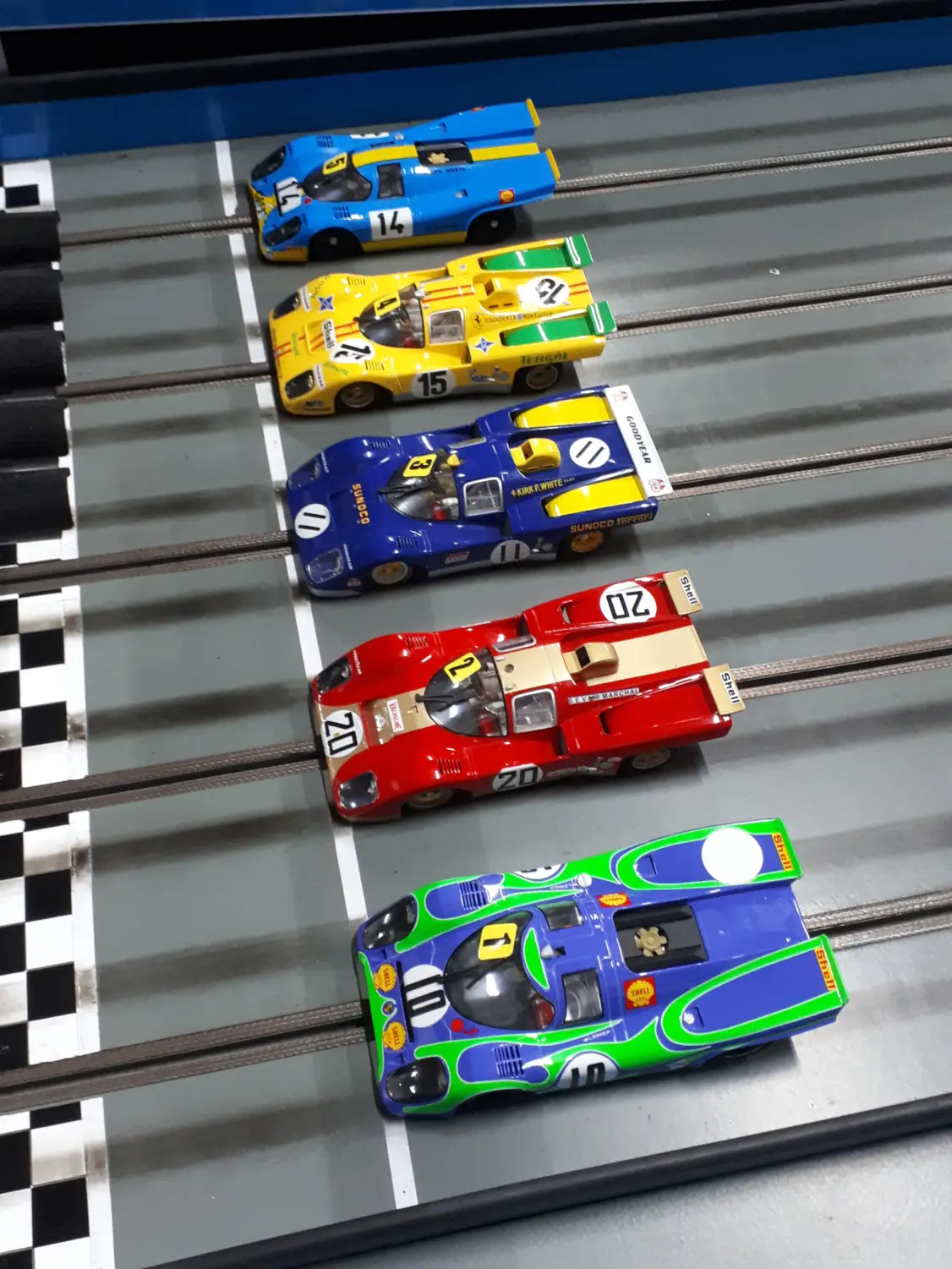 Das Qualifying selbst wurde, wie beim SRK gewohnt, auf der zentralen dritten Spur ausgefahren und dort machte eine ganze Reihe der TeilnehmerInnnen nachhaltig auf sich aufmerksam. Andi H. fuhr so gut wie noch nie und sicherte sich einen sehr ordentlichen 17. Startplatz. Bianca schaffte es, sich als 15. für das dritte Startfeld zu qualifizieren. Dummerweise rollte sie dabei prompt neben Poldi aus, der mit der exakt gleichen grünen Fuji-Piper-Variante des 917K an den Start gehen sollte, die man oben im dynamischen Rennbild auch sieht. Den gegenseitgen Durchblick verloren die beiden im Rennen danach gottlob aber nicht.