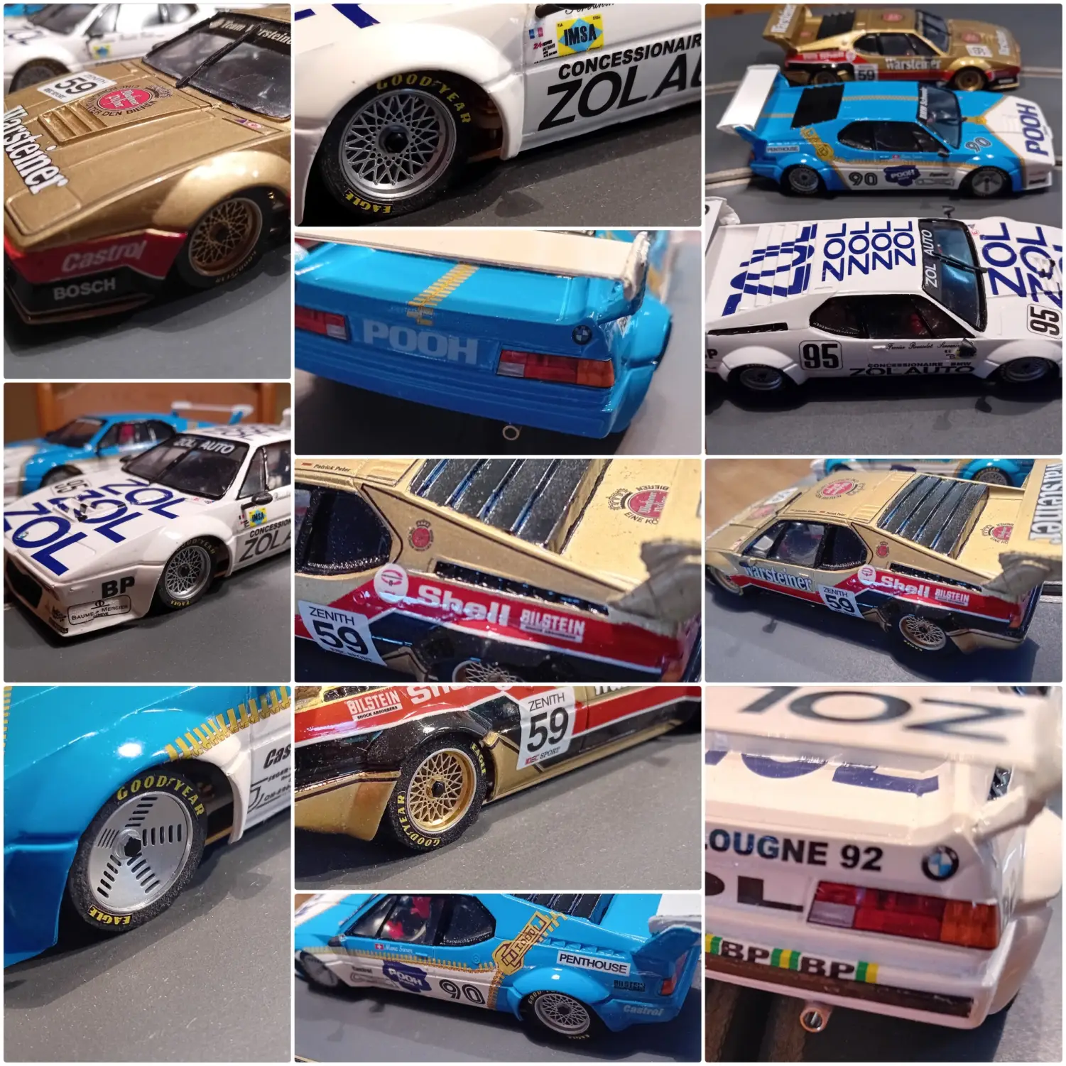 Da sich in den Testläufen herausstellte, dass die M1er verflucht schnell unterwegs sind, die leichten GfK-Bodys aber länger in Schönheit strahlen sollen, fahren wir die ProCars nur bei 11 Volt. Aus dem gleichen Grund erhält jeder unfallverursachende Chaosunterbrechungsauslöser – ein schönes Wort mit reichlich Interpretationsspielraum, Grinz – ein 3-Sekundenstarthandycap, wobei er bei einem ungünstigen Wiedereinsetzpunkt der Wagen leicht zurückgesetzt wird (z.B. bei der Kehre nach Start-Ziel). Wir erhoffen uns davon, dass die Modelle bei dem noch immer relativ niedrigen Gripniveau nicht zu oft jenseits des Grenzbereichs bewegt werden und wir gemeinsam ohne Kummer und kapitalen Flurschaden einen schönen Abend verbringen können.