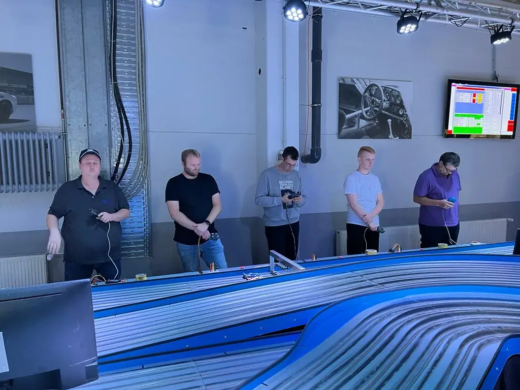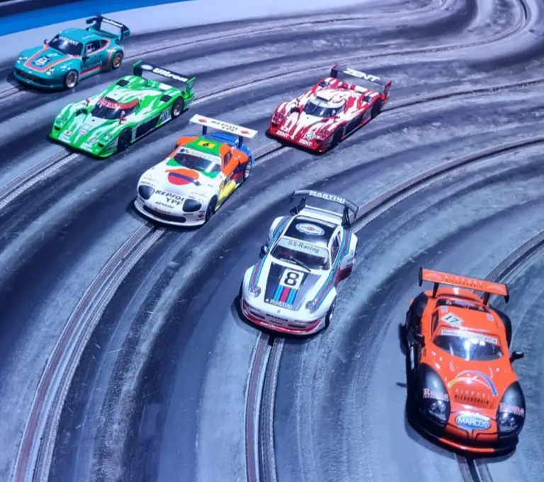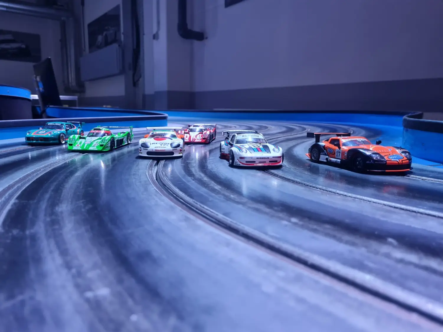 Alex hatte während seines Rennens einen Riesendusel, da sein F40 auf Spur “4” ausspurte und dann von Robse, der auf der “5” unterwegs war, unsanft und fulminant über die Bande gekickt wurde und auf dem Boden aufschlug. Normalerweise ist dann das Chassis krumm und das Rennen gelaufen, der rot-schwarze Keil kam jedoch mit dem Heckflügel der Karosserie auf und dieser rutschte dabei auch noch aus der Halterung und kompensierte die gespeicherte Sturzenergie zusätzlich. Der Italiener drehte unverändert seine Runden weiter. Glück muss man eben auch haben, sonst geht es nicht.